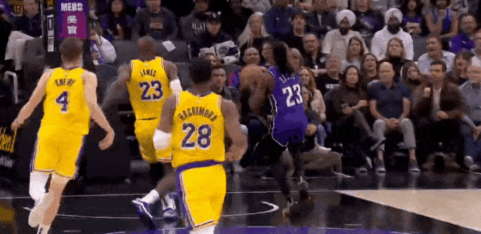 如果谁说詹姆斯只会半场防守的,那就把詹姆斯的钉板大帽晒出来!今天湖人对阵国王,比赛中,国王球员快攻,眼看就要上篮得手,詹姆斯第一时间赶到,直接又是一个钉板大帽,仔细看,湖人五个球员就詹姆斯跑的最快回防了,而且国王的蒙克这球其实传的很好,但是是詹姆斯追帽的点卡得太好了!#NBA#